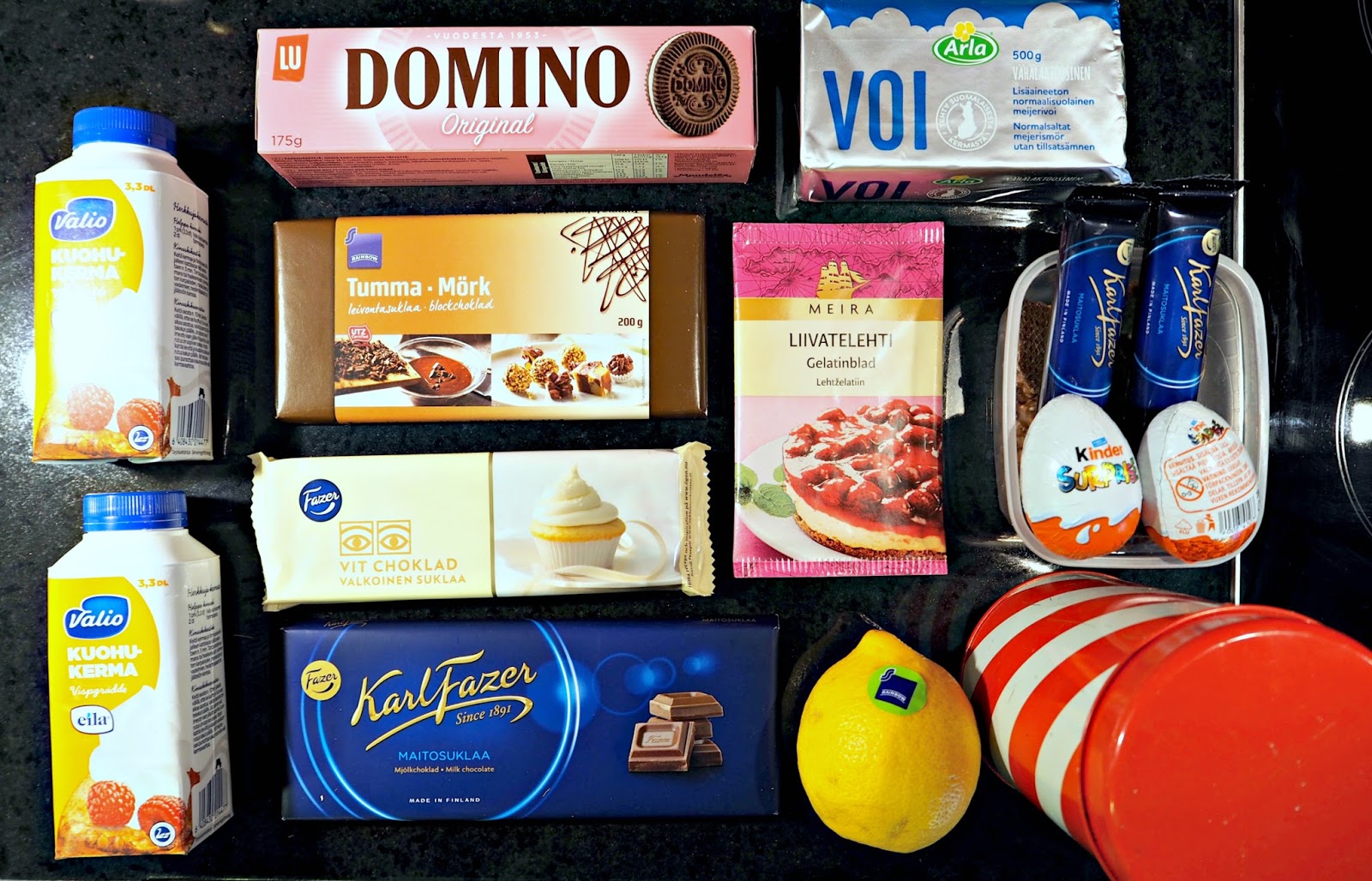 pohjaan: 175 g Domino-keksejä, 75 g voita sulatettuna
