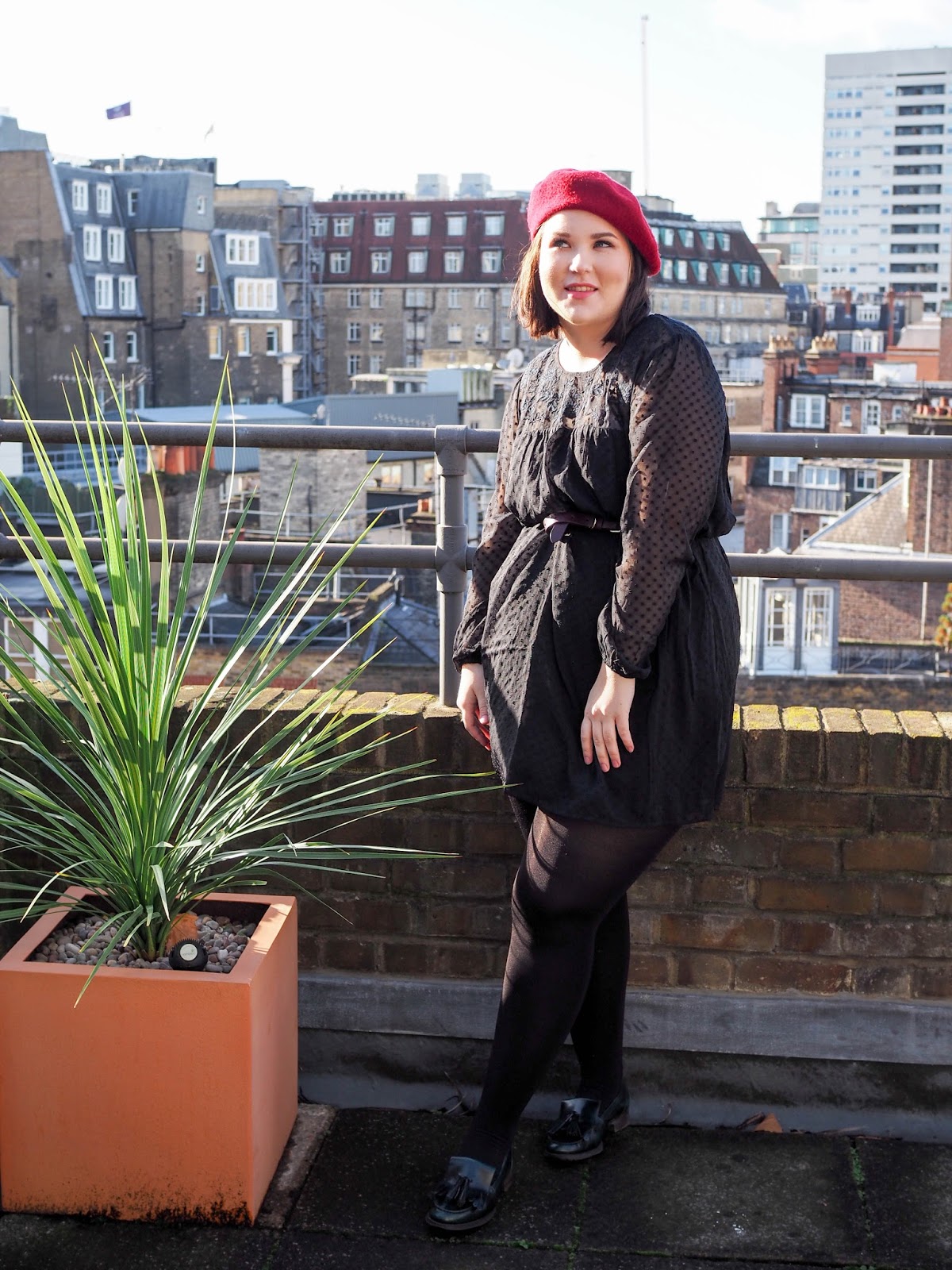 Mekko näyttää hyvältä ihan ilman vyötäkin, mutta päätin lisätä sen tähän, vähän vyötäröä tuomaan. Vyön toin mukanani sen tähden, että missionani oli ostaa Lontoosta uudet farkut. Tämä missio epäonnistui puoliksi, mutta tulipahan vyölle kuitenkin käyttöä. Juuri lähtiessä olin heittänyt myös tämän punaisen baskerin laukkuuni. Mulle tuli vain vahva tunne, että sille voi tulla käyttöä. No niinpä tulikin! Ilman sitä olisi asu ollut minusta liian tumma ja väritön, mutta pirteä punainen tuo siihen hiukan lisää elämää. Jalassa olivat luottoisat Clarksin kävelykengät, jotka näyttävät kyllä hyvinkin mustilta näissä kuvissa. Todellisuudessahan kengät ovat smaragdin vihreät.